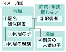 - ご家族とは、「記名被保険者(@)の配偶者(A)」および「記名被保険者またはその配偶者」の同居の子・同居の親族(B)・別居の未婚の子(C。婚姻歴のある方は含みません。)をいいます。